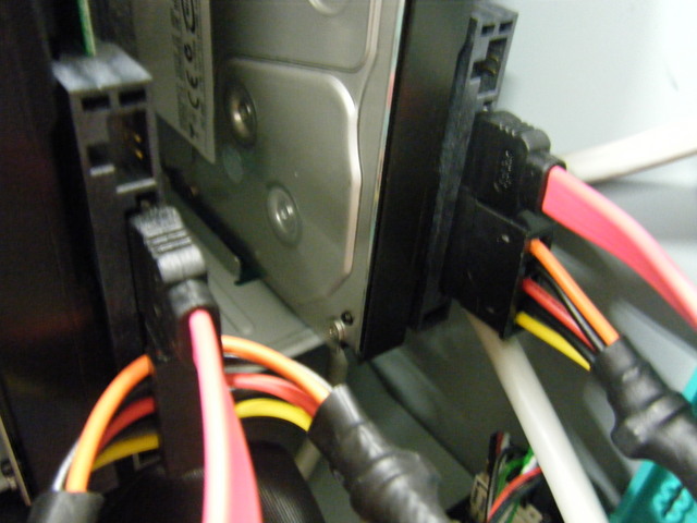 ハードディスクドライブ (HDD) の電源ケーブルを抜きます. 写真の下側が電源ケーブルです.